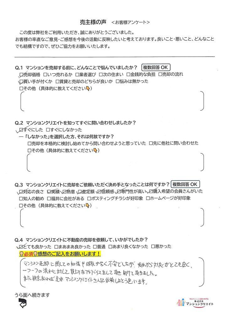 とても良かった。マンション売却に関しての知識や経験がなく不安でしたが、初めから対応がとても良く、一つ一つの流れに対して親切なアドバイスをして頂き助けて頂きました。また機会があれば是非マンションクリエイトさんに依頼しようと思います。